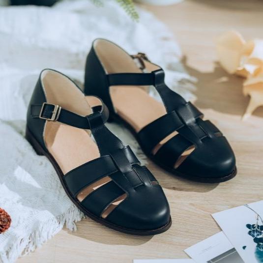 SC1020 法國進口牛皮編織原木底涼鞋 黑